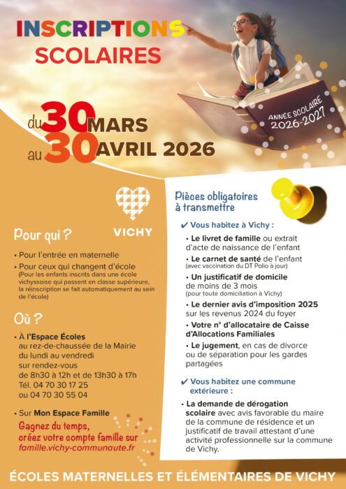 Les inscriptions pour les écoles maternelles et élémentaires de Vichy sont ouvertes du 30 mars au 30 avril 2026. Cette démarche concerne les enfants qui feront leur entrée en maternelle à la rentrée prochaine, ainsi que ceux qui changent d’école.