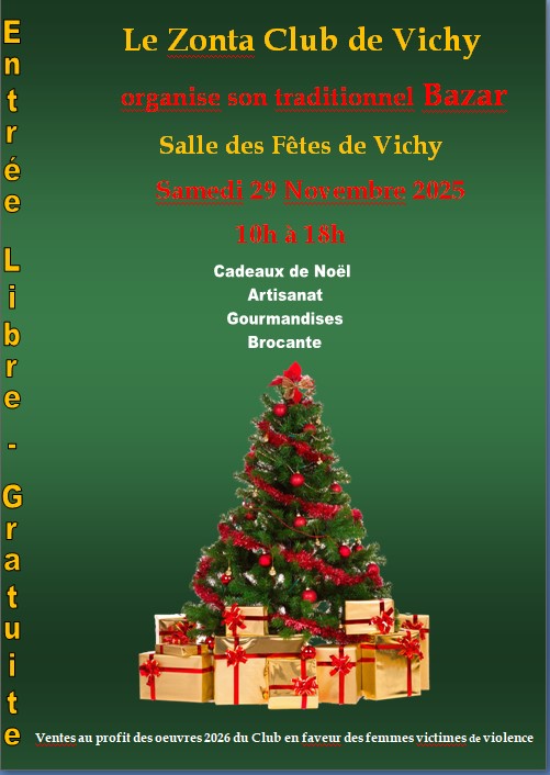 Vente de gourmandises, décorations de Noël, artisanat et brocante au profit de notre association le Zonta Club de vichy qui oeuvre en faveur de la défense du droit des femmes