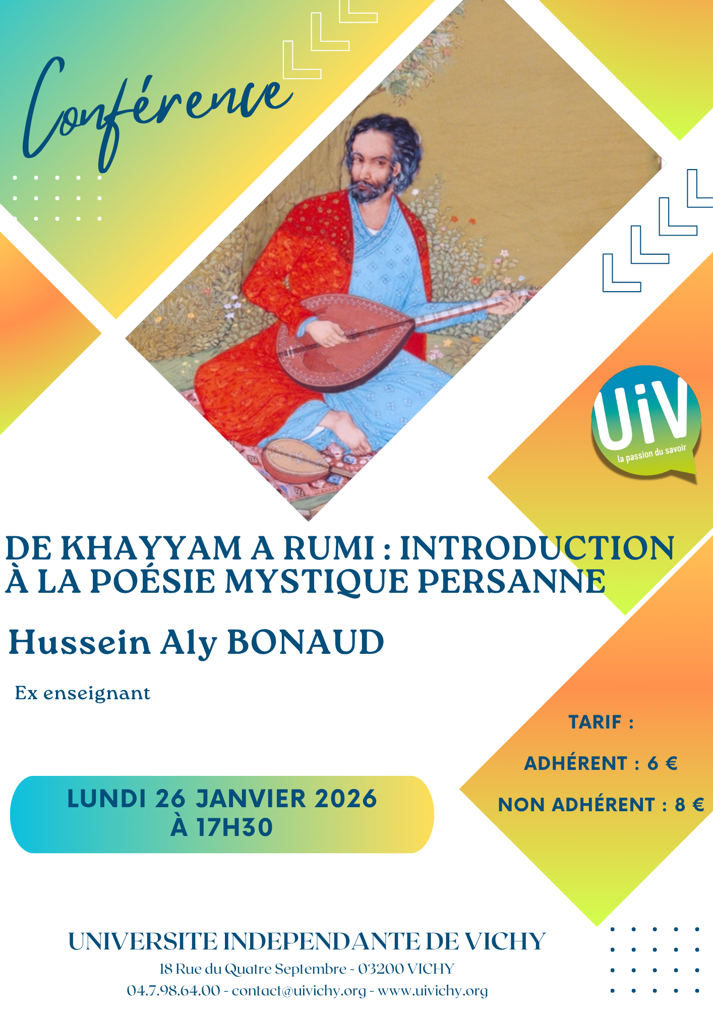 “ Plongez dans l’univers envoûtant des grands poètes soufis persans, de leur histoire, de leurs symboles et de leur quête. Cette conférence invite à un voyage spirituel et poétique où l’amour, le doute et l’extase s’entrelacent, et où les mots cachent souvent des messages inattendus et des mystères inexprimables.