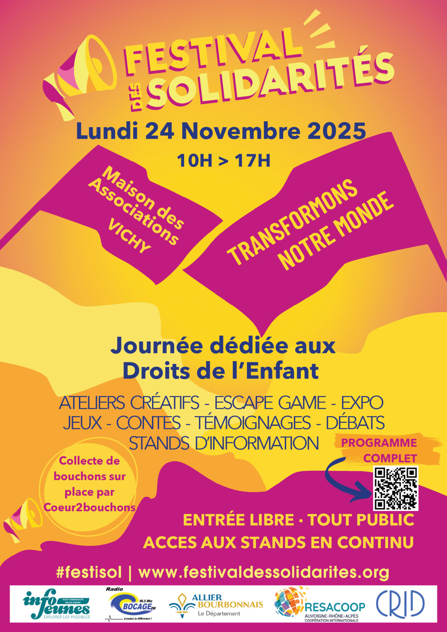 Ateliers créatifs, escape game, expositions, jeux, contes, témoignages, débats, stands d’informations… différents espaces seront mis à disposition du public pour en apprendre plus et s’engager pour un monde plus juste, solidaire et durable.