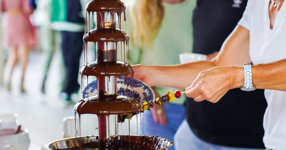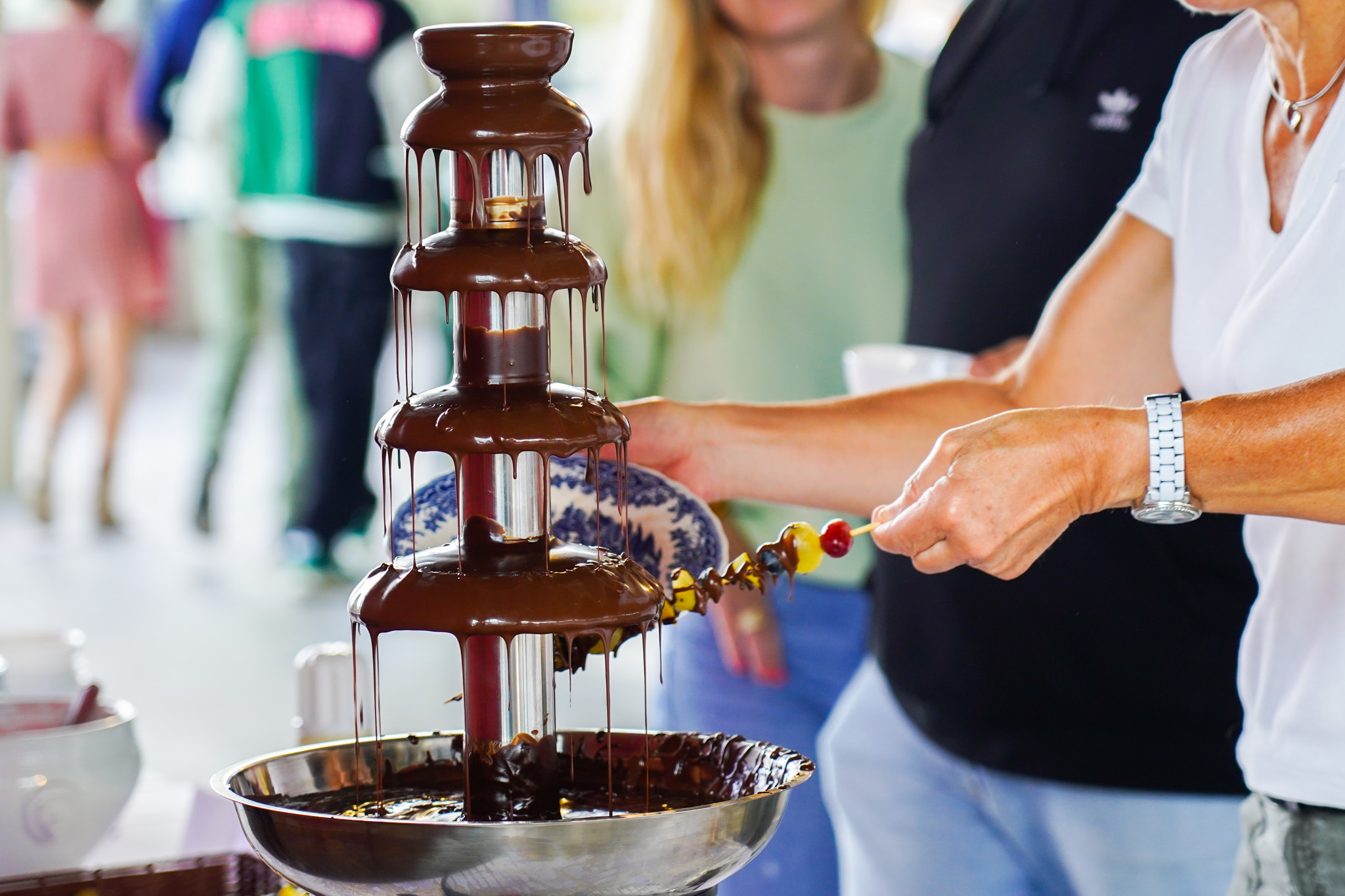 Granola bowl, brioche façon pain perdu, crumble aux pommes, financier, fontaine de chocolat, brochettes de fruits et fruits frais