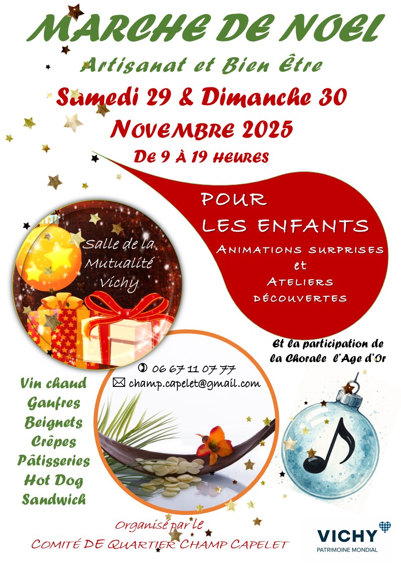 Artisanat et bien être, animations, ateliers découvertes et surprises de Noël pour les enfants, buvette vin chaud, beignets, gaufres, crêpes, pâtisseries maison, hot dog, sandwich….