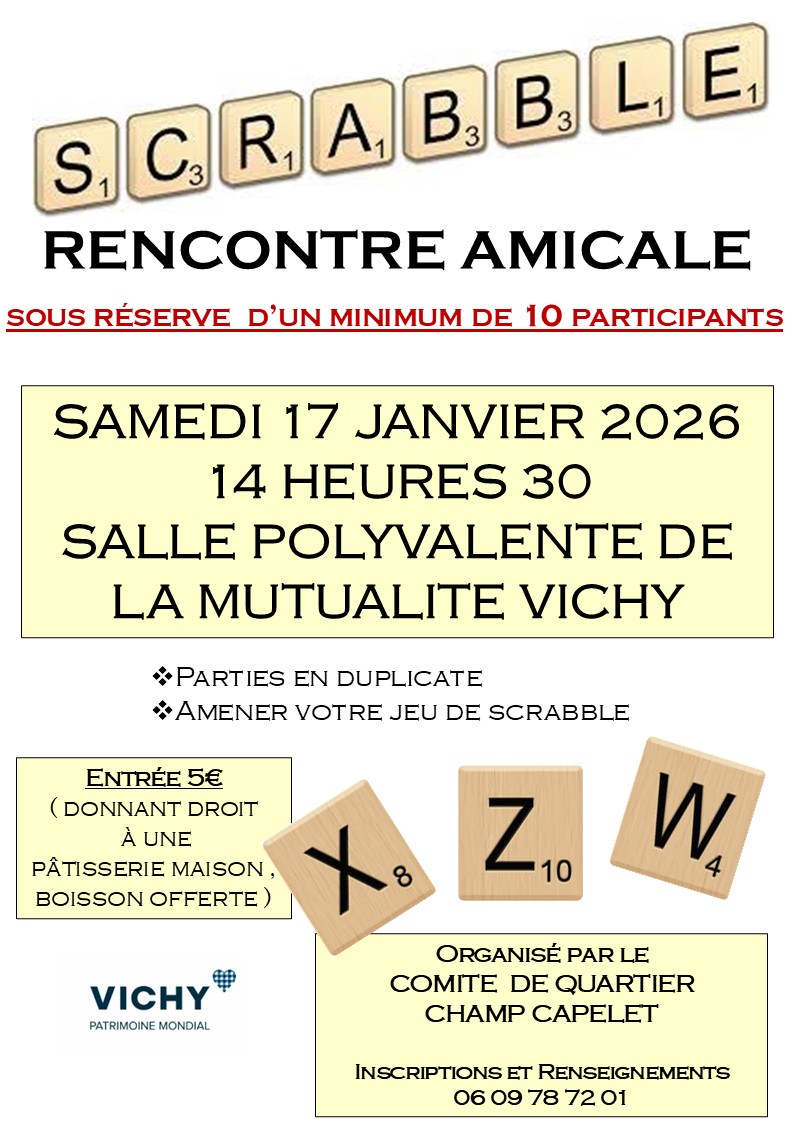 Rencontre amicale de Scrabble SAMEDI 17 JANVIER 2026 dès 14H30 salle polyvalente de la Mutualité Frais de participation 5€.