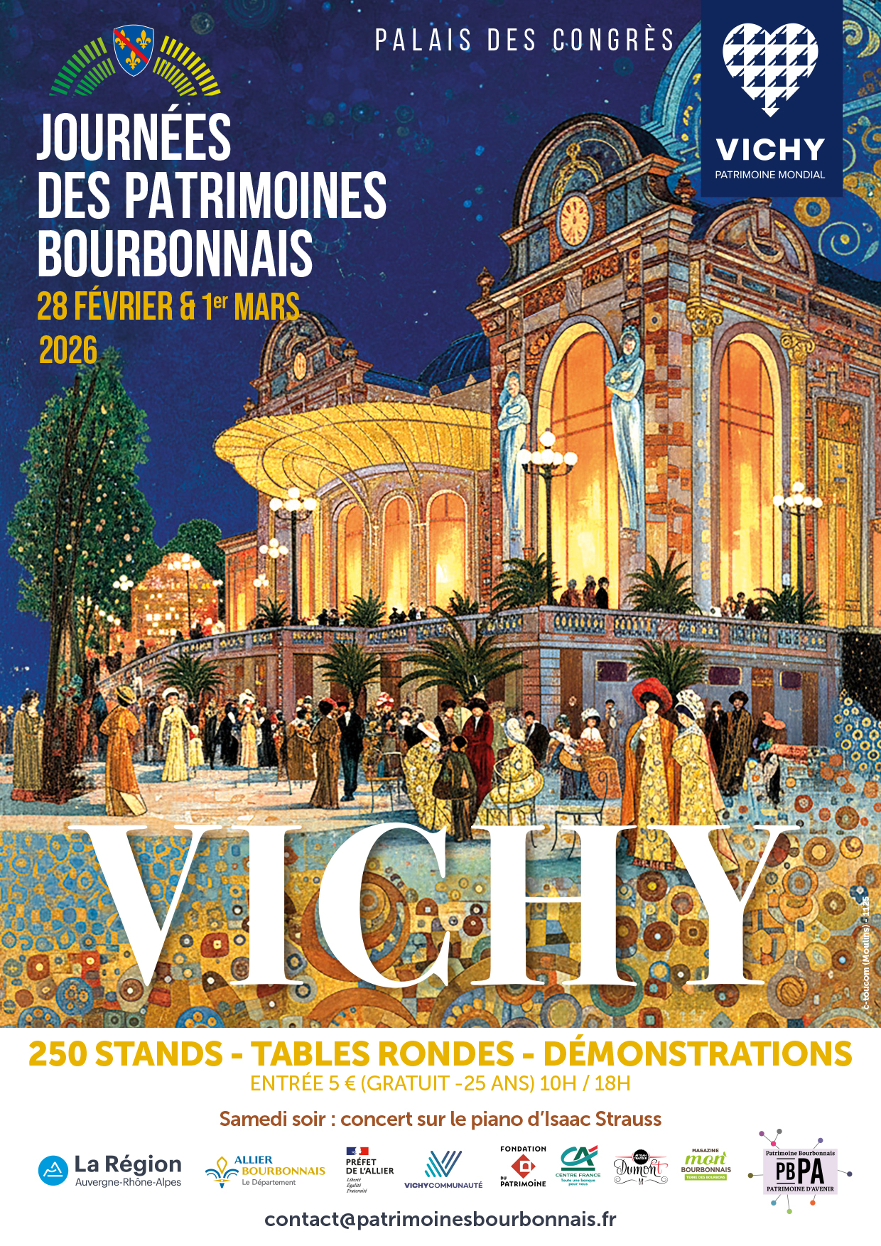 Dans le cadre des Journées des Patrimoines Bourbonnais, des visites guidées de la ville sont organisées par Vichy Destinations. Sur présentation du billet d’entrée au salon des « Journées des Patrimoines Bourbonnais », le tarif réduit vous sera proposé (6,50€ par personne) :